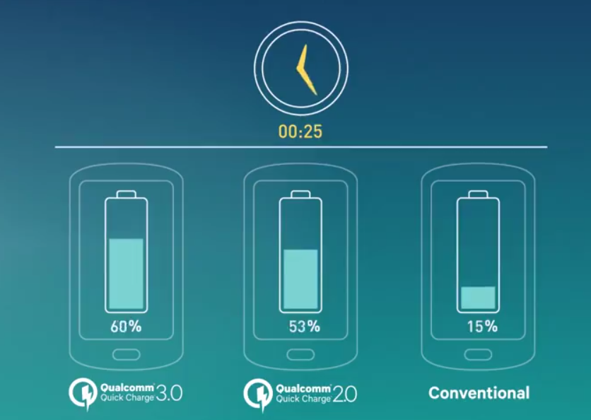 QC3.0相比QC2.0就比较含蓄点,输出电压在3.6V至20V之间。输出电压变动是阶梯型:0.2V一节一节升上去或者降下来,同时兼容QC2.0直接升9V,12V,20V的性格。还是由于由于压差的关系,QC3.0比QC2.0效率会提高,发热量降低,充电时间减少。(按照高通的说法,QC3.0能够比QC2.0效率提升38%,充电速度提升27%,发热降低45%,大约35分钟内就能将一部典型手机从零电量充电至80%。)