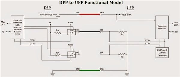 在 DFP的 CC pin有上拉电阻 Rp,在 UFP有下拉电阻 Rd。未连接时, DFP的 VBUS是无输出的。连接后, CC pin相连, DFP的 CC pin会检测到 UFP的下拉电阻 Rd,说明连接上了, DFP就打开 Vbus电源开关,输出电源给 UFP。而哪个 CC pin(CC1, CC2)检测到下拉电阻就确定接口插入的方向,顺便切换 RX/TX。
