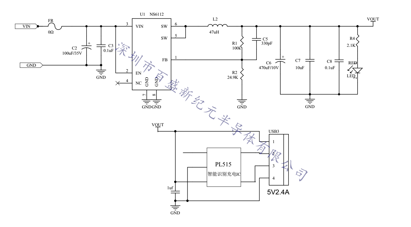 NS6112单口2.4A智能识别车充原理图:
