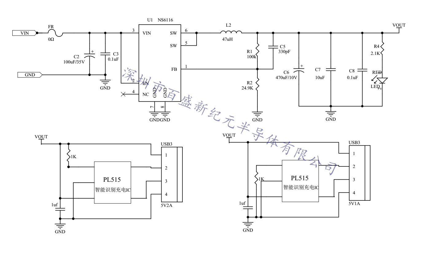 NS6116双口2A+1A智能识别车充原理图: