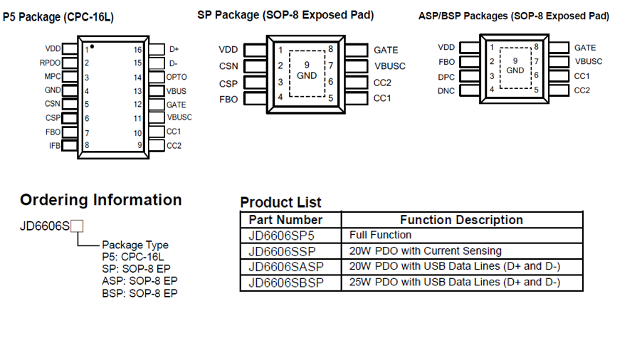 从封装上来区分,JD6606S有三种脚位的IC,如下: