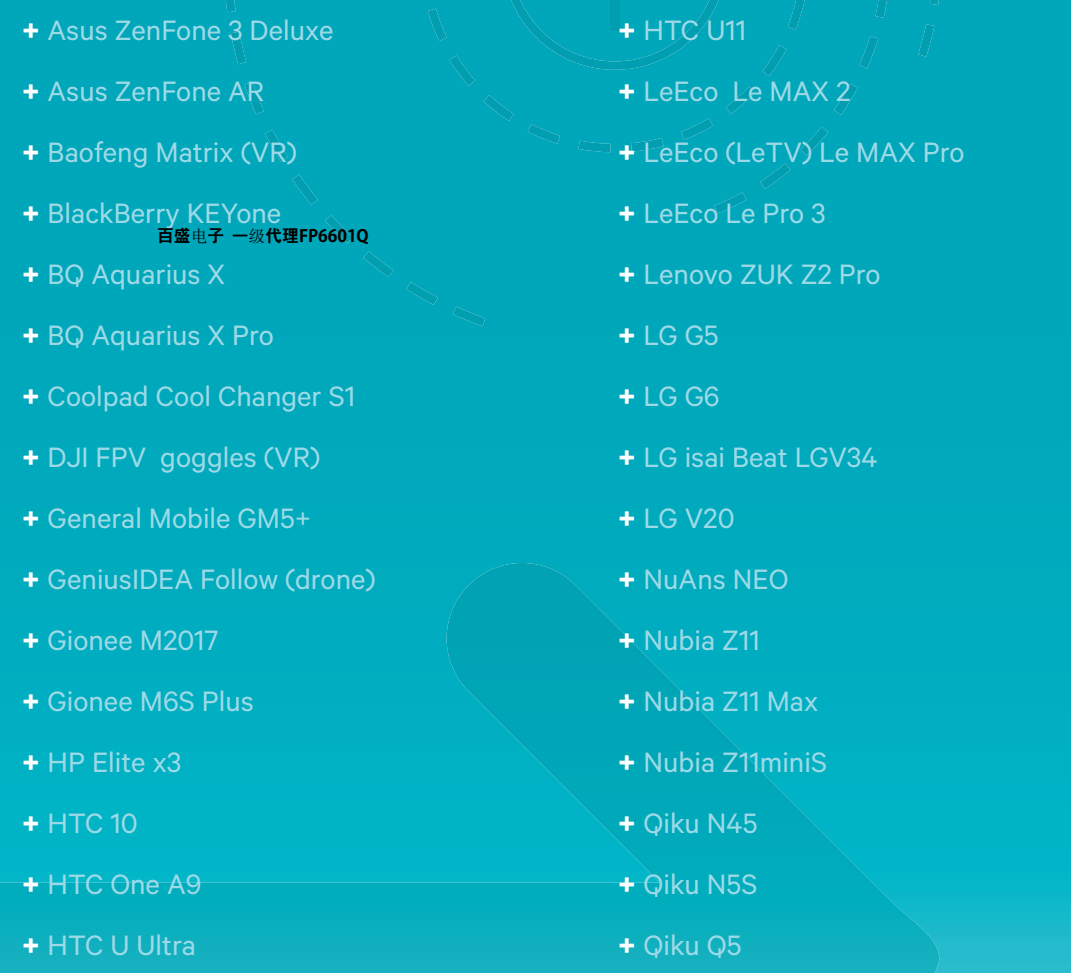 Asus ZenFone 3 Deluxe Asus ZenFone ARBaofeng Matrix (VR) BlackBerry KEYone BQ Aquarius X BQ Aquarius X ProCoolpad Cool Changer S1 DJI FPV goggles (VR) General Mobile GM5+ GeniusIDEA Follow (drone)Gionee M2017 Gionee M6S Plus