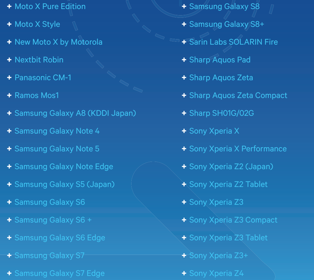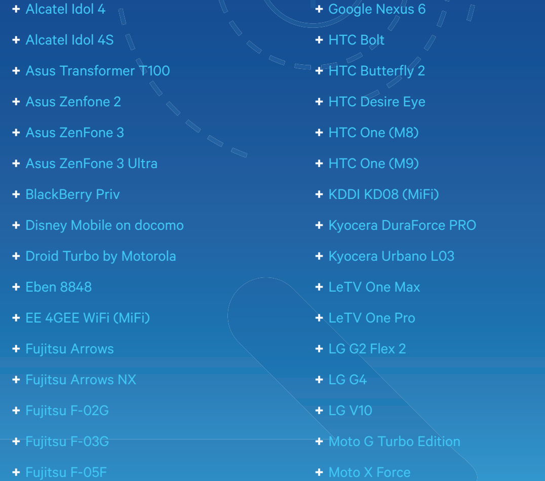 Alcatel Idol 4 Alcatel Idol 4S Asus Transformer T100 Asus Zenfone 2 Asus ZenFone 3 Asus ZenFone 3 Ultra BlackBerry Priv Disney Mobile on docomo Droid Turbo by Motorola Eben 8848 EE 4GEE WiFi (MiFi) Fujitsu Arrows Fujitsu Arrows NX Fujitsu F-02G Fujitsu F-03G Fujitsu F-05F Google Nexus 6