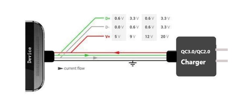 QuickCharge3.0/2.0是纯快速充电的协议,专注的只有充电,只能单向电能传输。协议是通过D+,D-手机和协议芯片来通讯进行握手匹配,然后再提高改变V+(输出电压),使充电功率增加,充电就更快。