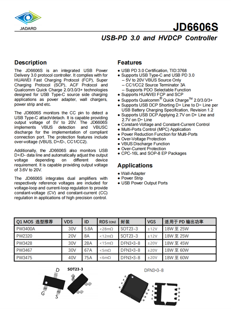 JD6606S是一个集成的USB电源传输3.0协议控制器。符合HUAWEI快速充电协议(FCP)、超级充电协议(SCP)、ACF协议和高通快速充电2.0/3.0/3+技术,专为USB型c源侧充电应用,如电源适配器、壁式充电器、充电条等。