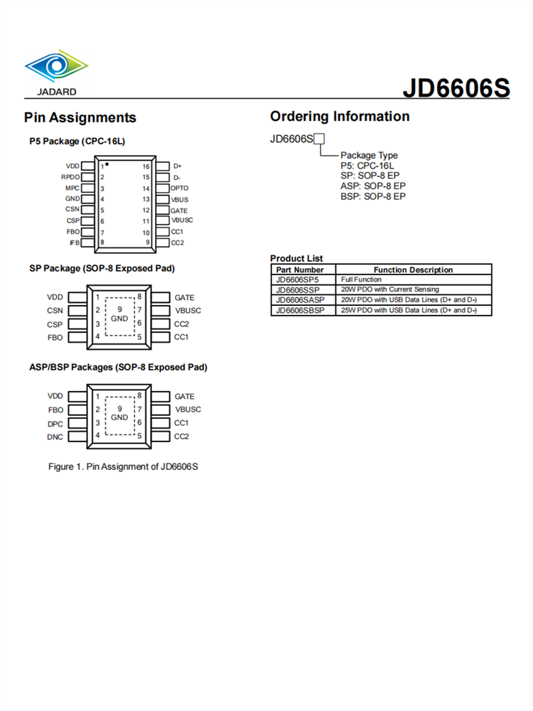 JD6606S监控CC引脚,以检测USB型-C型连接/分离。它能够提供5V至20V的输出电压。JD6606S实现了VBUS检测和VBUSC放电,以实现兼容的连接端口。保护功能包括过电压(VBUS、D+/D-、CC1/CC2)。